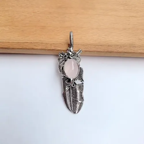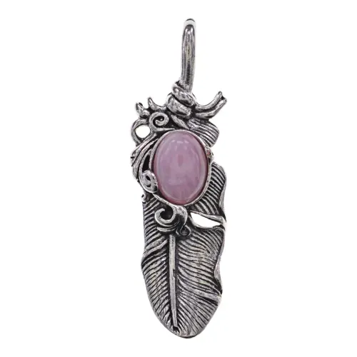 Кулон в форме пера с вставкой из натурального розового кварца.