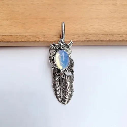 Кулон в форме пера с вставкой из синтетического лунного камня.