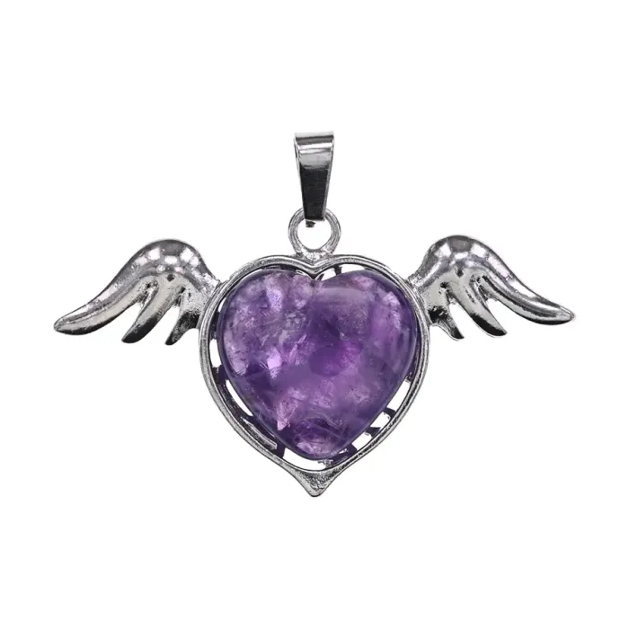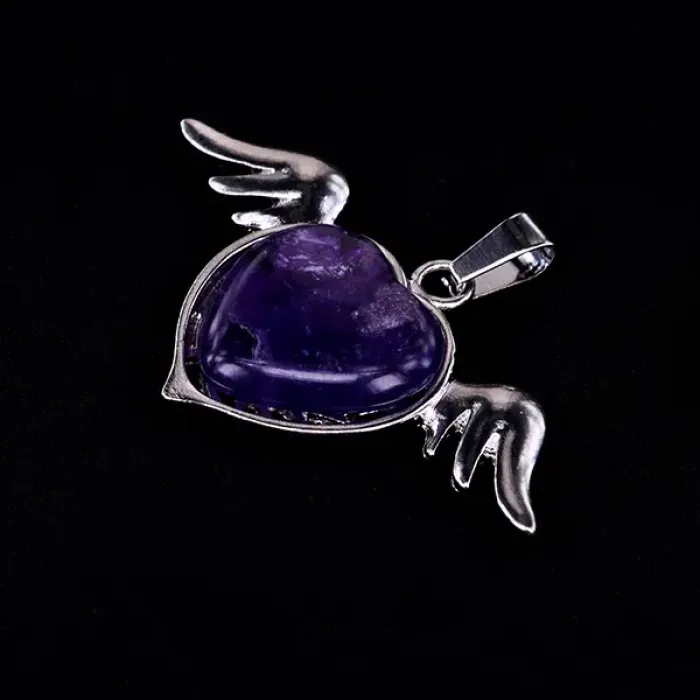 Кулон из бижутерного сплава в форме сердца с крыльями, украшенный натуральным аметистом.