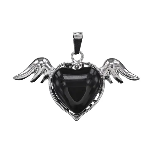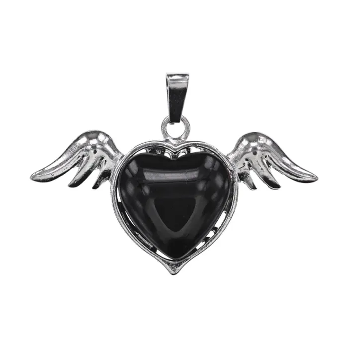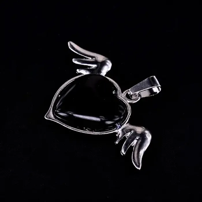 Кулон из бижутерного сплава с вставкой из натурального черного агата в форме сердца с крыльями.