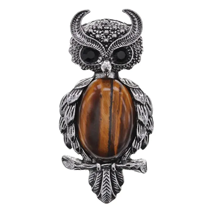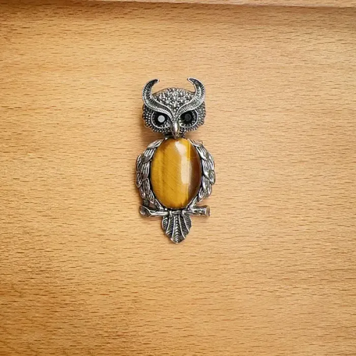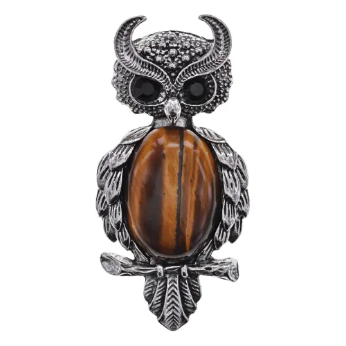 Кулон в виде совы из бижутерного сплава с натуральным камнем тигровый глаз и стразами.