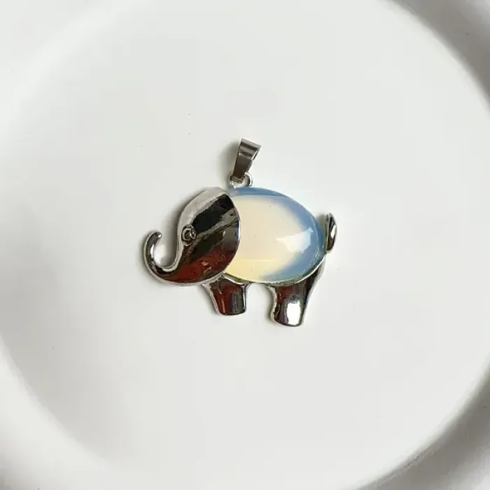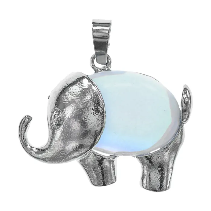 Кулон в виде слона из бижутерного сплава с покрытием под серебро и вставкой из синтетического лунного камня.