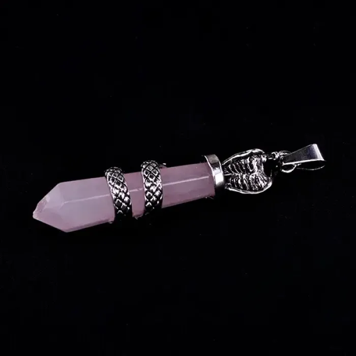 Кулон в виде змеи из бижутерного сплава с вставкой из натурального розового кварца.