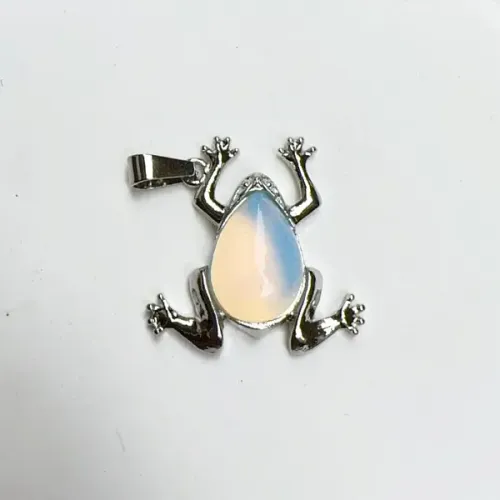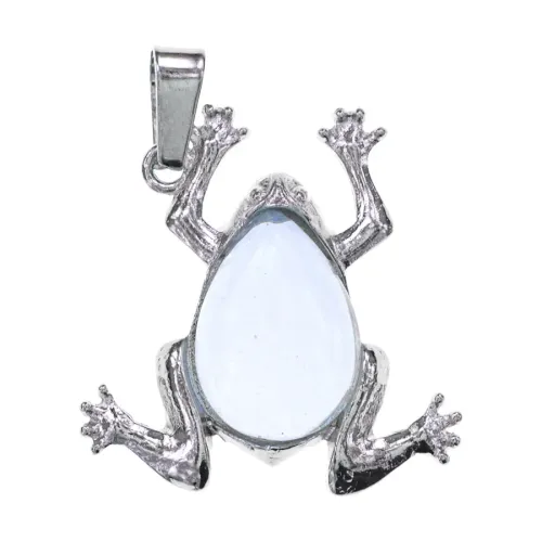 Кулон в виде лягушки из бижутерного сплава с вставкой из синтетического лунного камня.