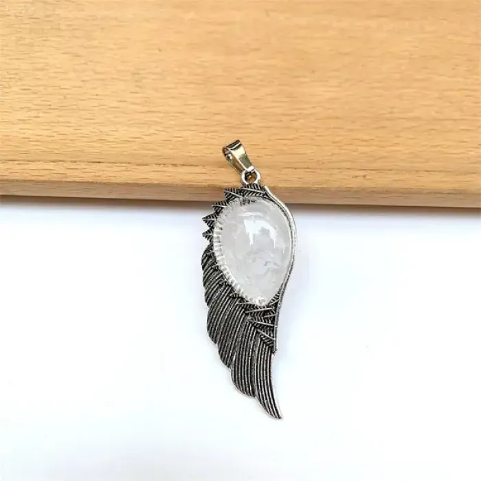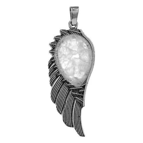 Кулон в форме крыла из бижутерного сплава с вставкой из натурального горного хрусталя.