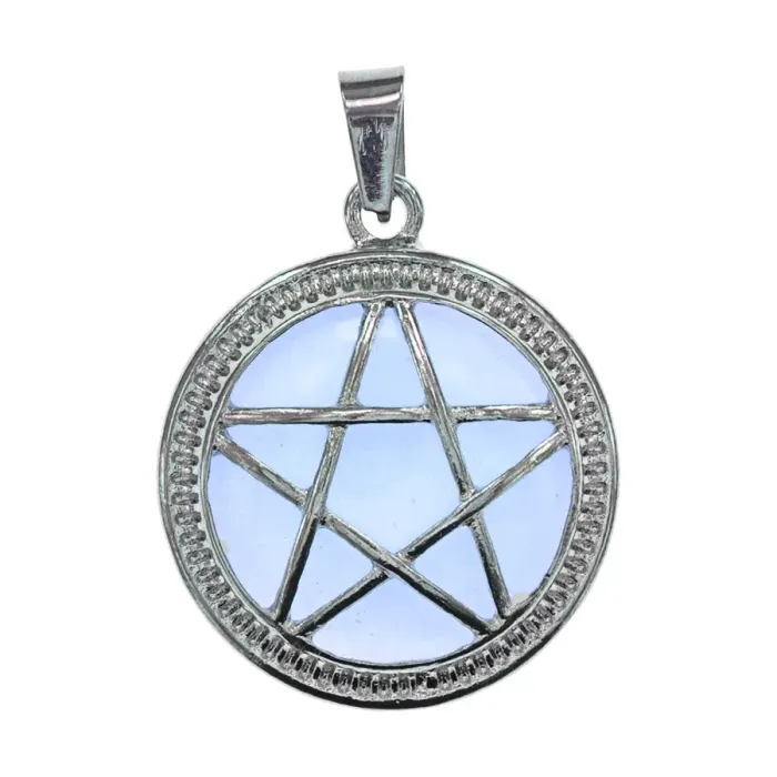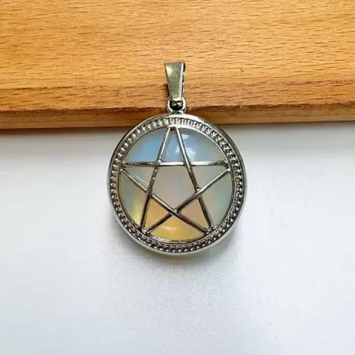 Кулон в виде пентаграммы с вставкой из синтетического лунного камня и стекла.