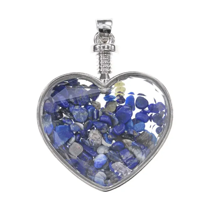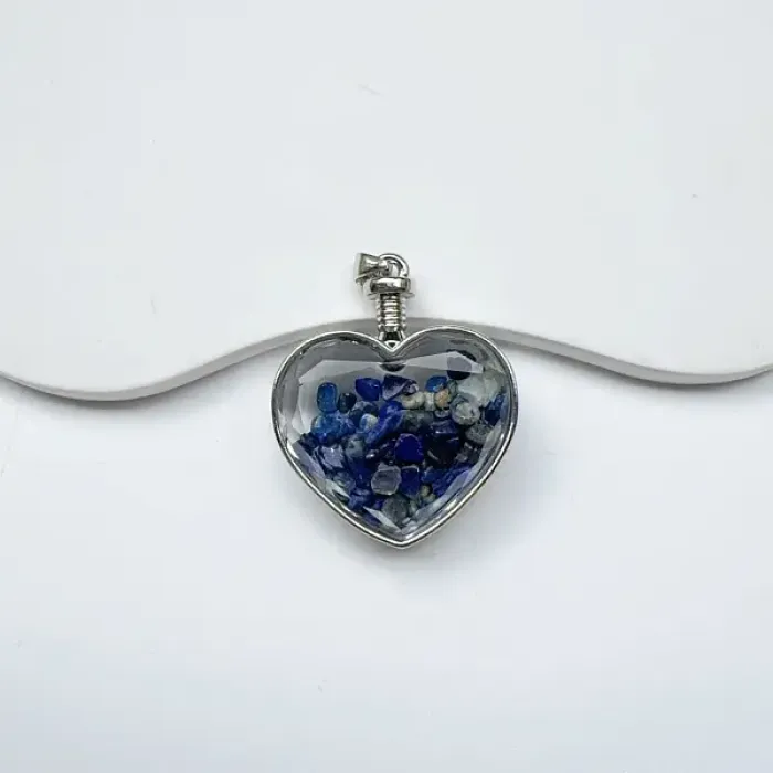 Кулон в форме сердца из бижутерного сплава с вставкой из натурального лазурита и стекла.