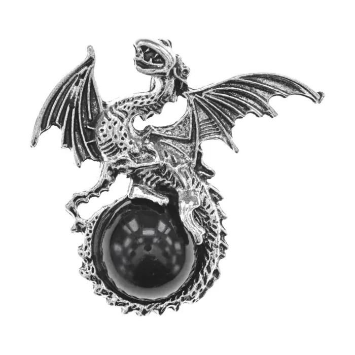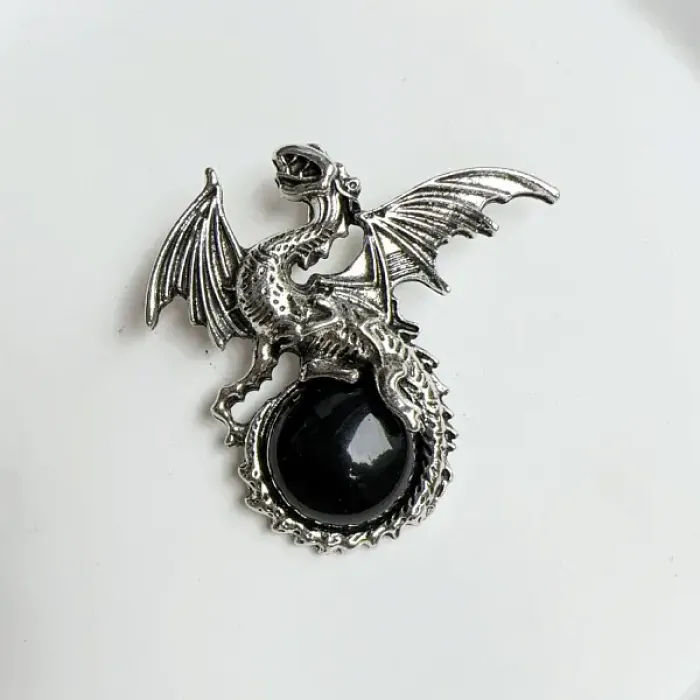 Кулон из бижутерного сплава с покрытием под серебро и вставкой из натурального черного агата. Дизайн в виде дракона.