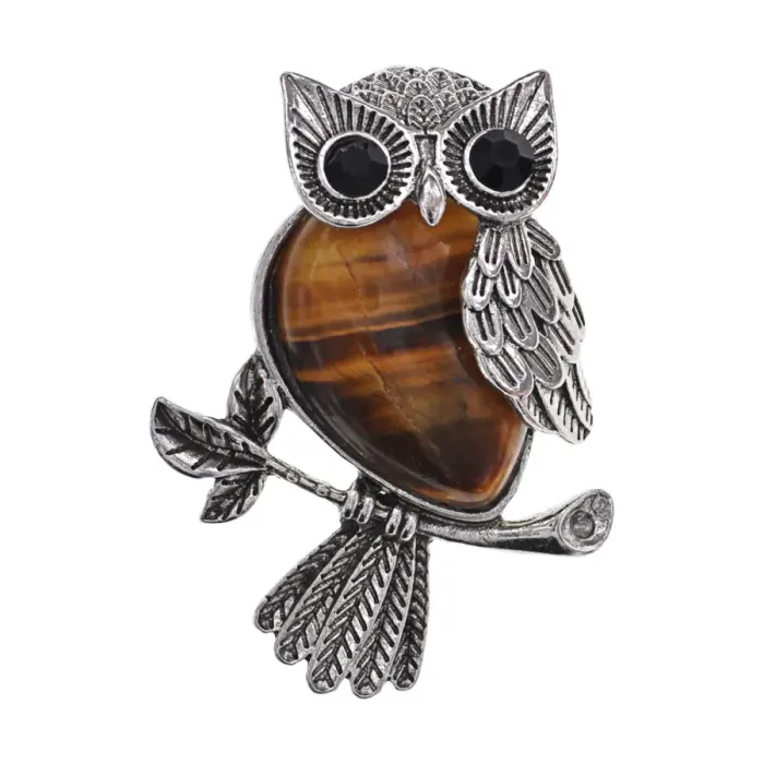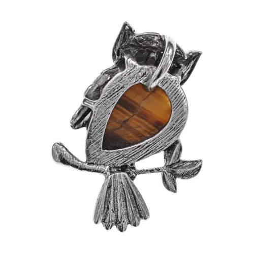 Кулон в форме совы из бижутерного сплава с натуральным тигровым глазом.