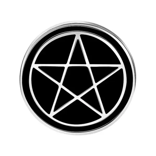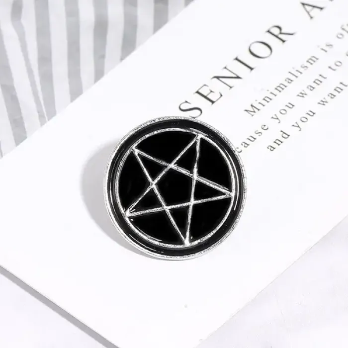 Значок с символом пентаграммы. Металлический аксессуар с эмалевым покрытием.