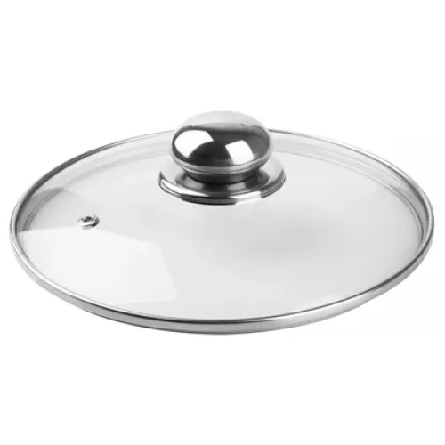 Крышка изготовлена из термостойкого стекла, устойчивого к высоким температурам. Металлический ободок из нержавеющей стали защищает края от механических повреждений и сколов. Конструкция включает пароотвод диаметром 0,5 см для регулирования давления и эргономичную ручку-кнопку для удобного захвата.