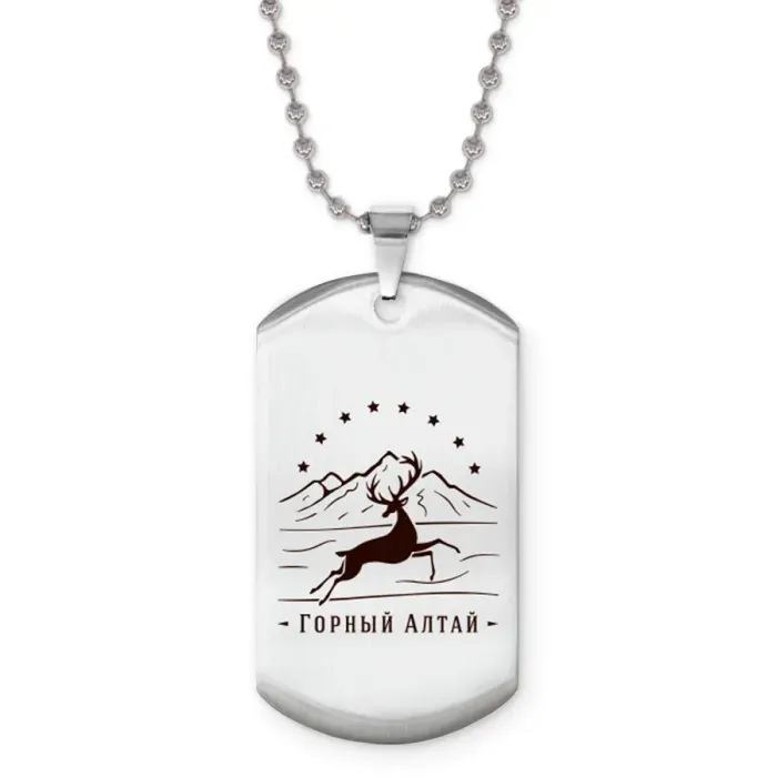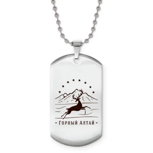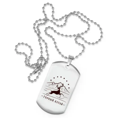Сувенирный жетон на цепочке «Горный Алтай». Материал — полированная нержавеющая сталь, на одной стороне нанесена гравировка.