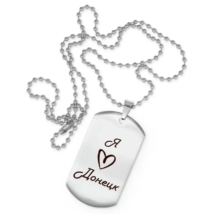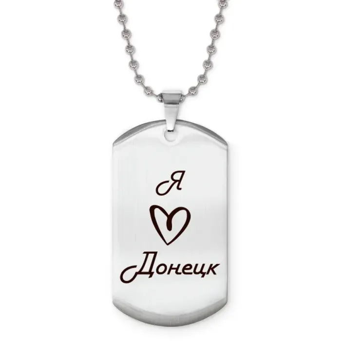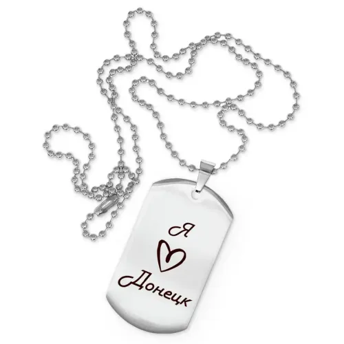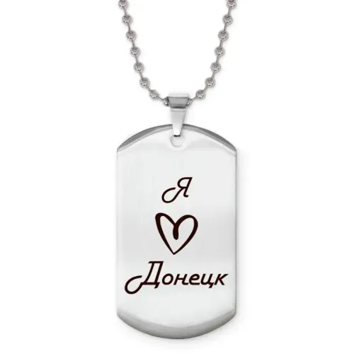 Сувенирный жетон на цепочке с гравировкой «Я люблю Донецк». Изготовлен из полированной нержавеющей стали.