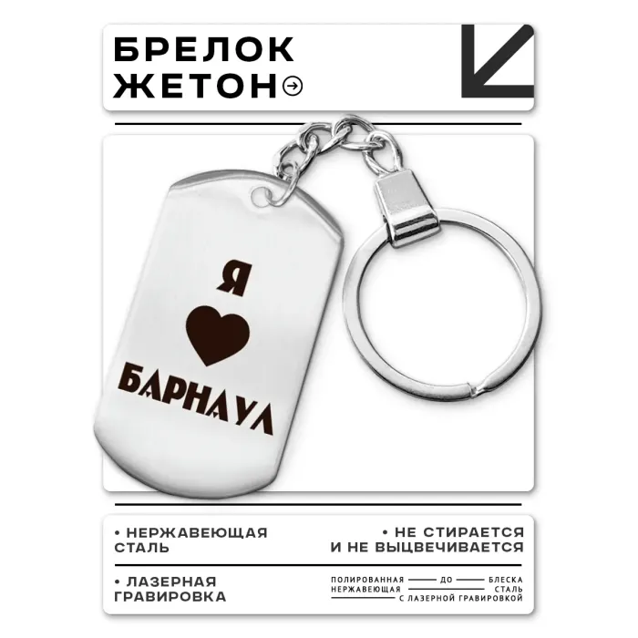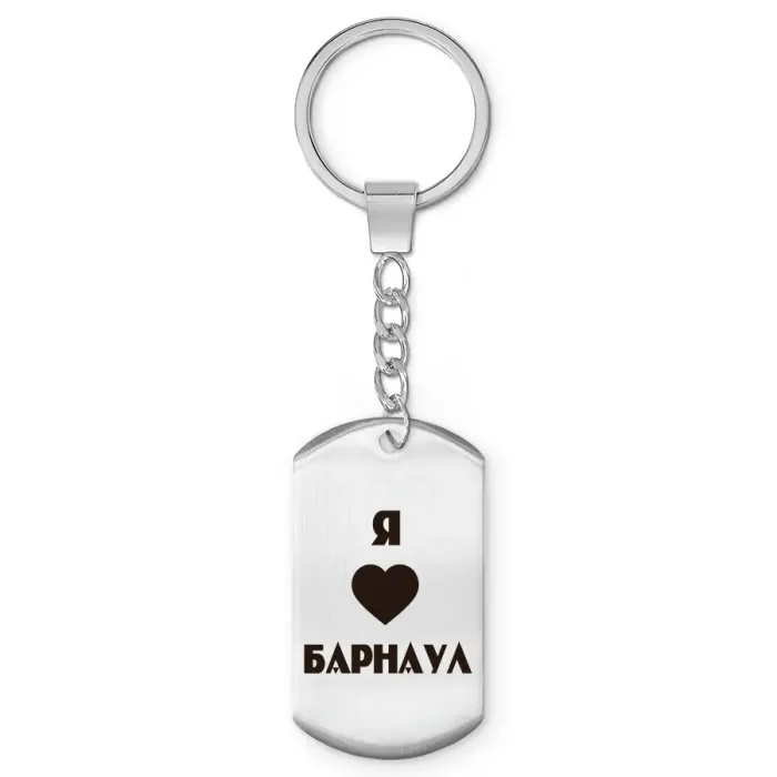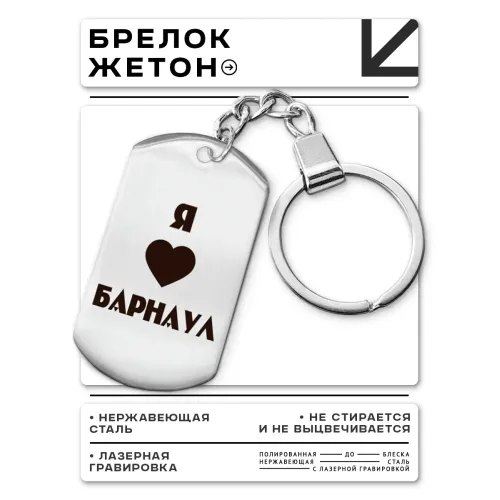 Брелок-жетон «Я люблю Барнаул» — сувенирный аксессуар из полированной нержавеющей стали с гравировкой изображения на одной стороне.