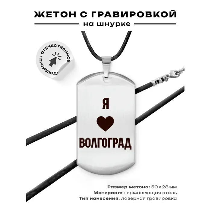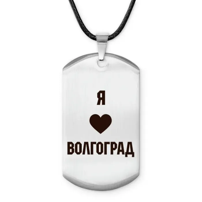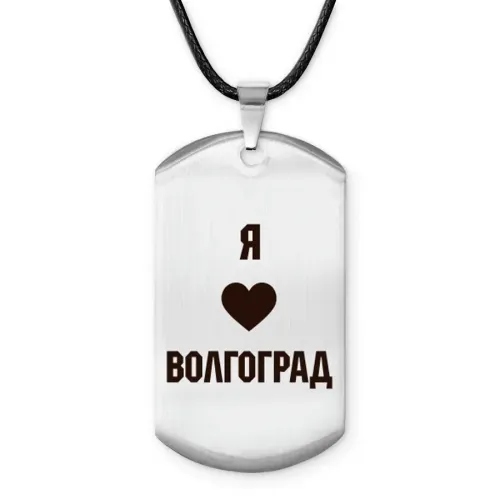 Амулет-жетон с гравировкой «Я люблю Волгоград». Изготовлен из полированной нержавеющей стали.