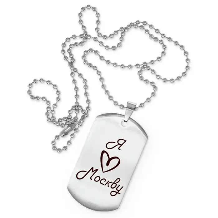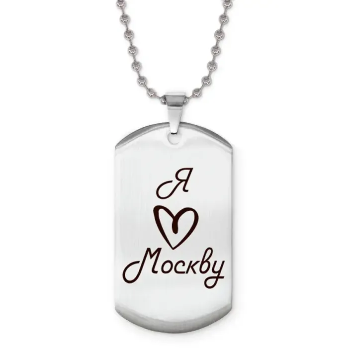 Сувенирный жетон на цепочке с гравировкой «Я люблю Москву». Изготовлен из полированной нержавеющей стали.