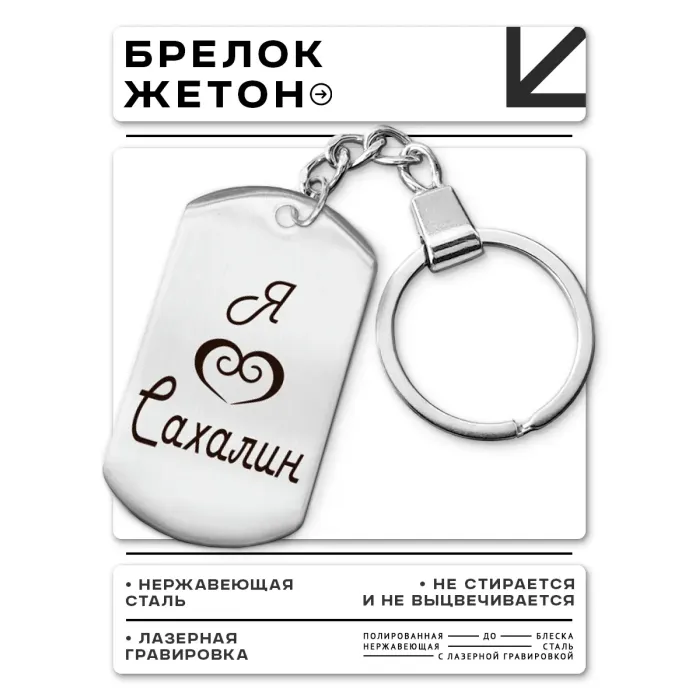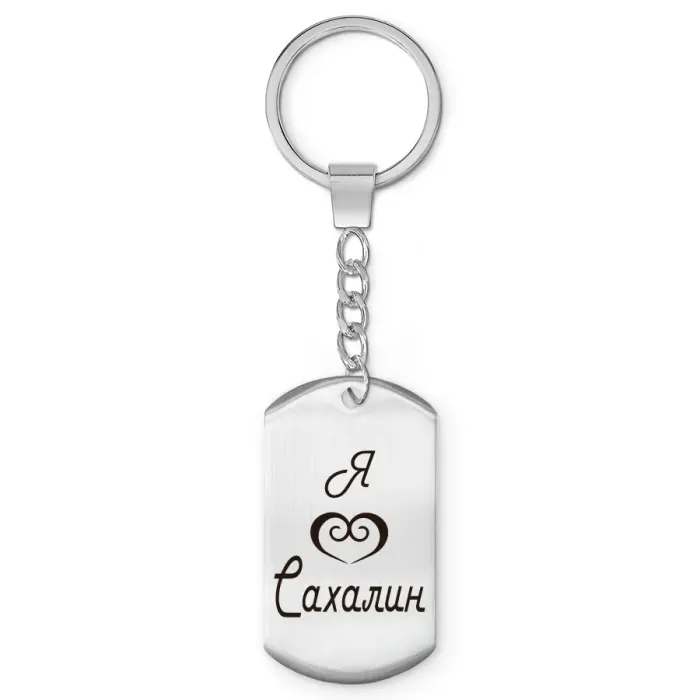 Брелок-жетон сувенирный с гравировкой «Я люблю Сахалин». Изготовлен из полированной нержавеющей стали.