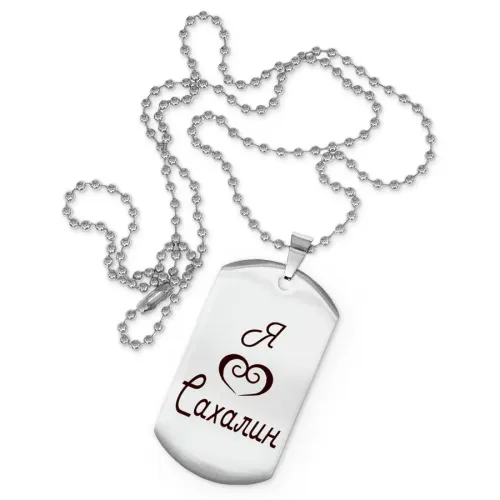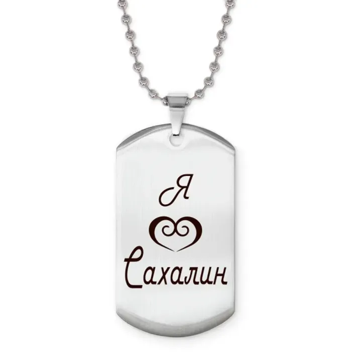 Сувенирный жетон на цепочке с гравировкой «Я люблю Сахалин». Изготовлен из нержавеющей стали с полировкой.