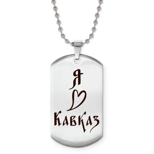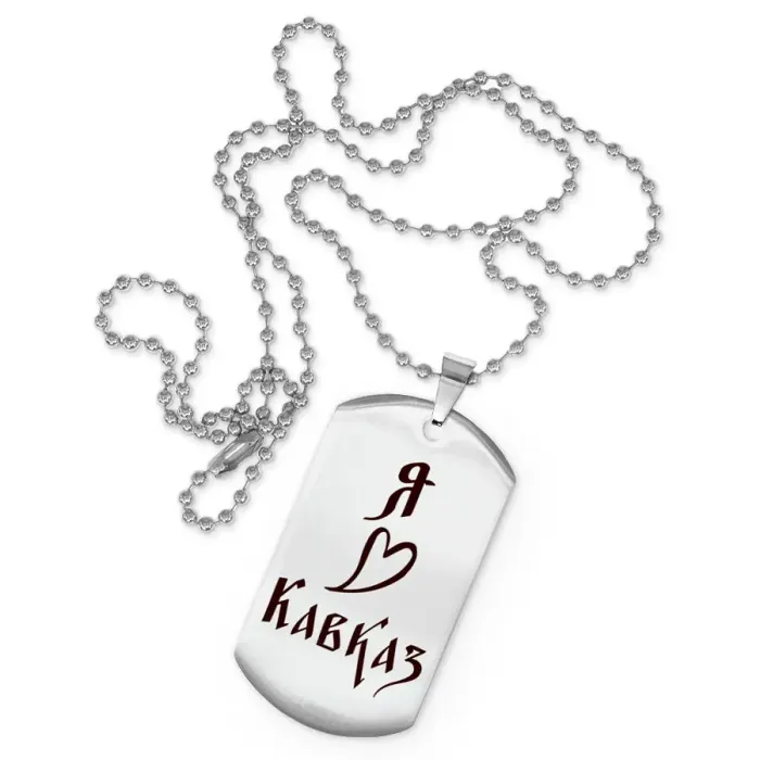 Сувенирный жетон на цепочке с гравировкой «Я люблю Кавказ». Изготовлен из полированной нержавеющей стали.