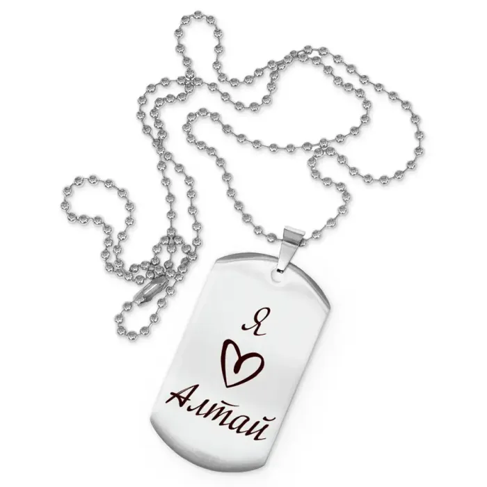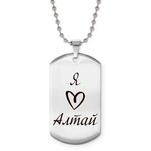 Сувенирный жетон на цепочке с гравировкой «Я люблю Алтай». Изготовлен из нержавеющей стали.