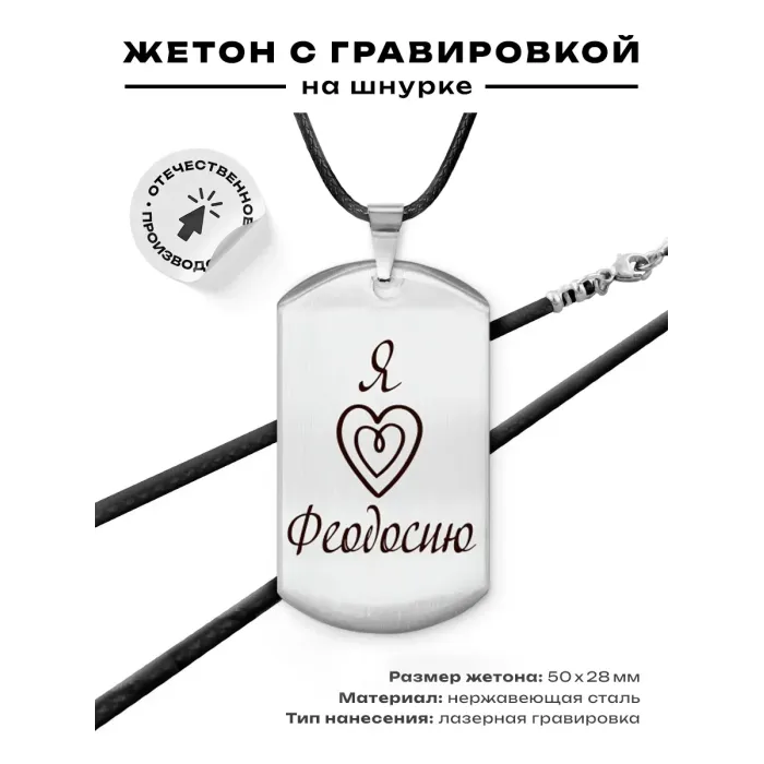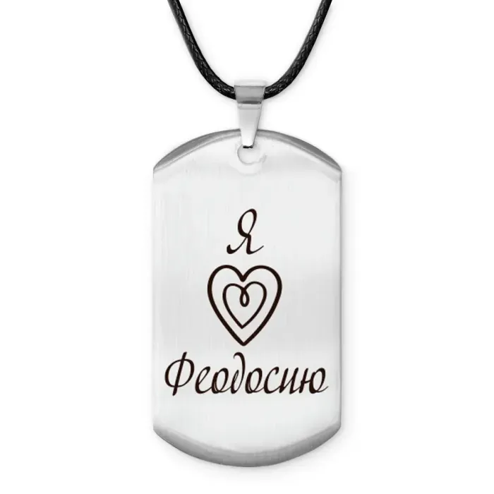 Амулет-жетон «Я люблю Феодосию» — сувенирный аксессуар из полированной нержавеющей стали с гравировкой.
