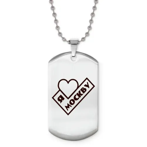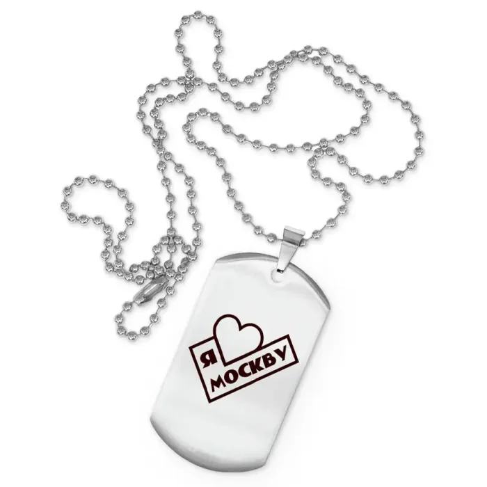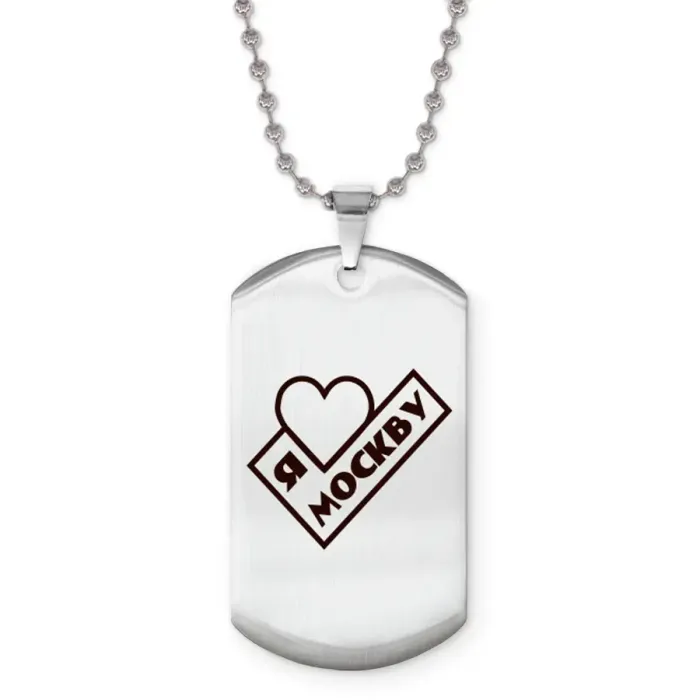 Сувенирный жетон на цепочке с гравировкой «Я люблю Москву». Материал — полированная нержавеющая сталь.