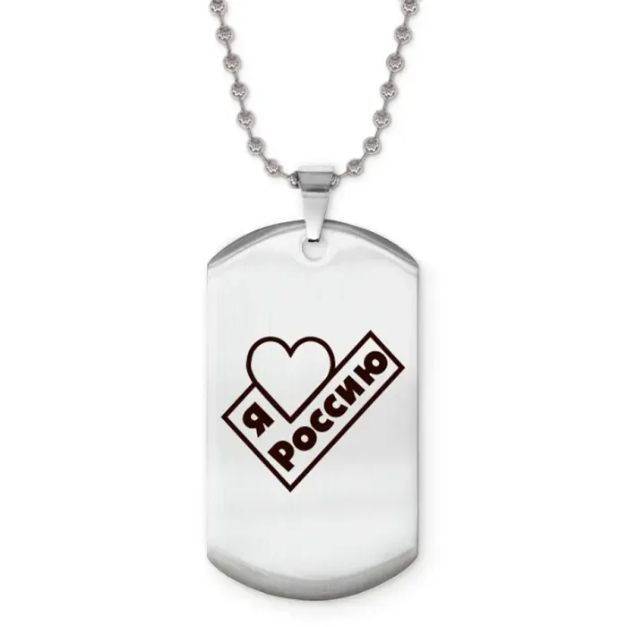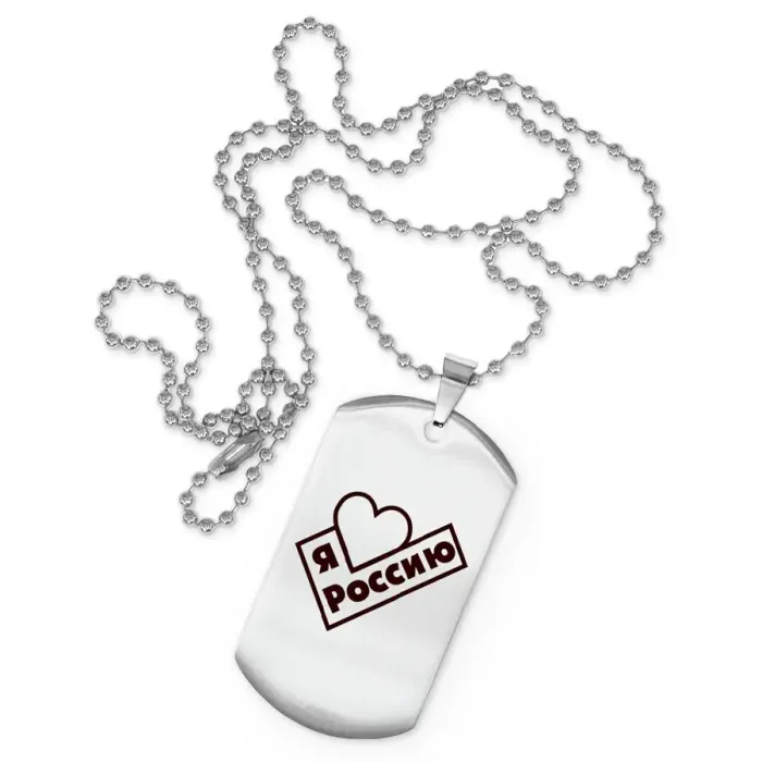 Сувенирный жетон на цепочке с гравировкой «Я люблю Россию». Изготовлен из полированной нержавеющей стали.