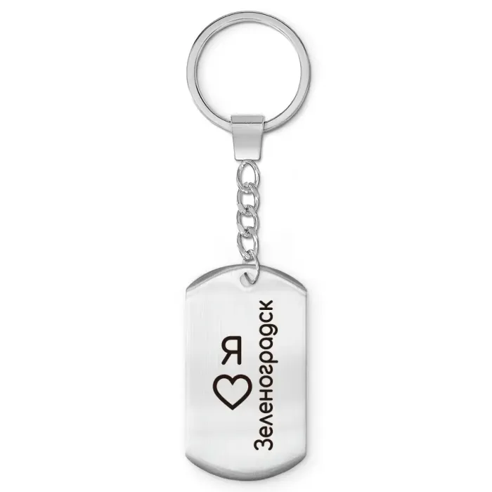 Брелок-жетон сувенирный с гравировкой «Я люблю Зеленоградск». Материал — полированная нержавеющая сталь.