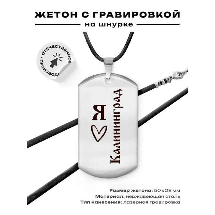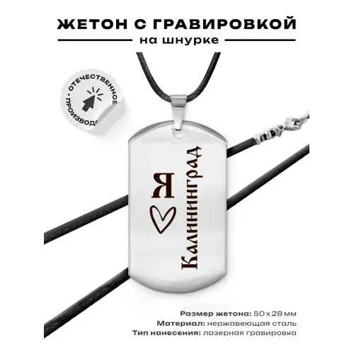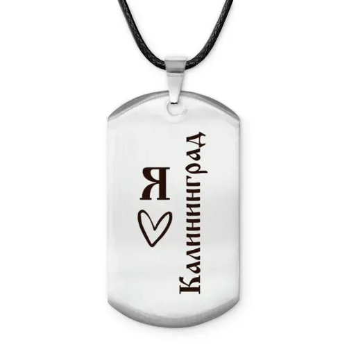 Амулет-жетон 'Я люблю Калининград' — сувенирный аксессуар из полированной нержавеющей стали с гравировкой.
