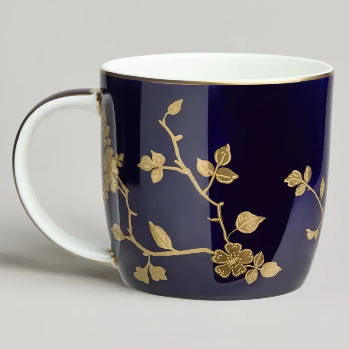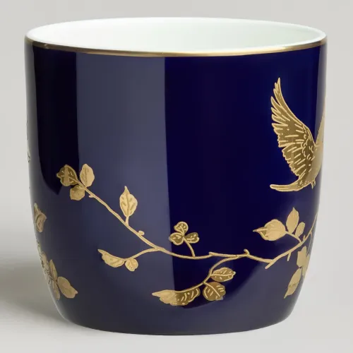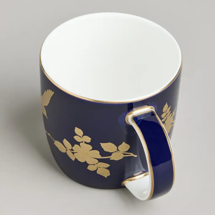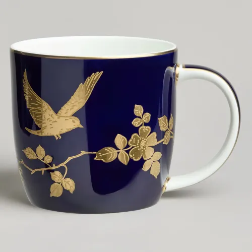 Кружка выполнена из фарфора, материала, известного прочностью и устойчивостью к температурным перепадам. Поверхность изделия легко моется. Дизайн украшен декоративными элементами с изображением птиц.