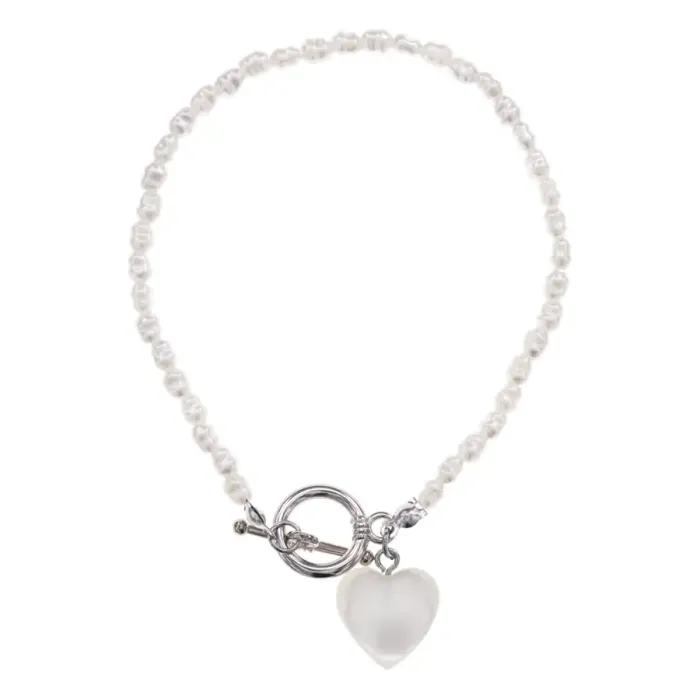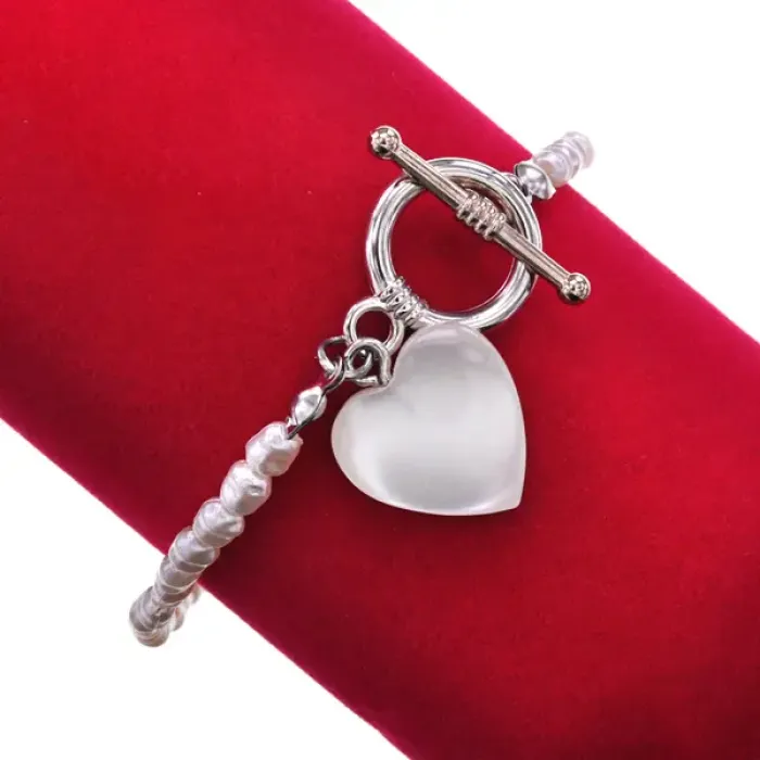 Бижутерный браслет с подвеской в виде сердца. Материал: сплав с покрытием под серебро, искусственный жемчуг, пластик и синтетический камень.