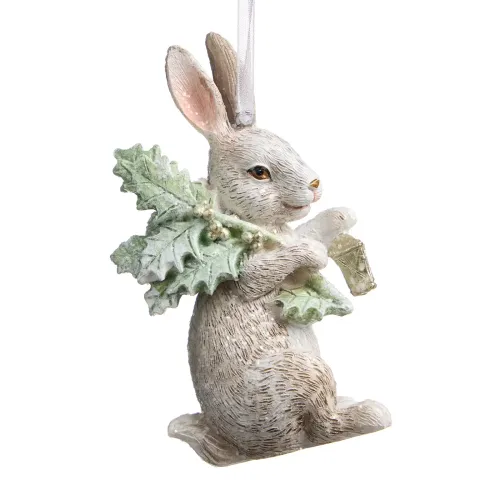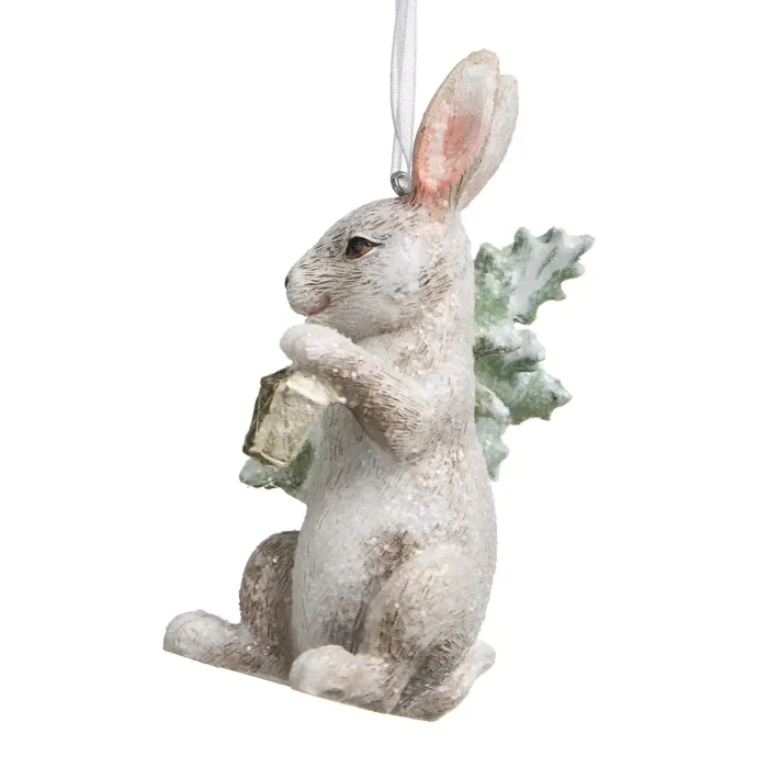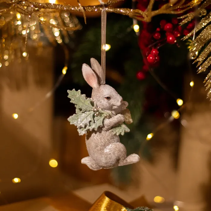 Фигурка кролика отличается высокой детализацией и устойчивостью к повреждениям. Полистоун — экологичный материал, который обеспечивает долговечность изделия. Украшение легко вписывается в различные стили новогоднего оформления благодаря универсальному дизайну.