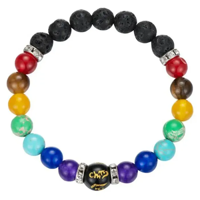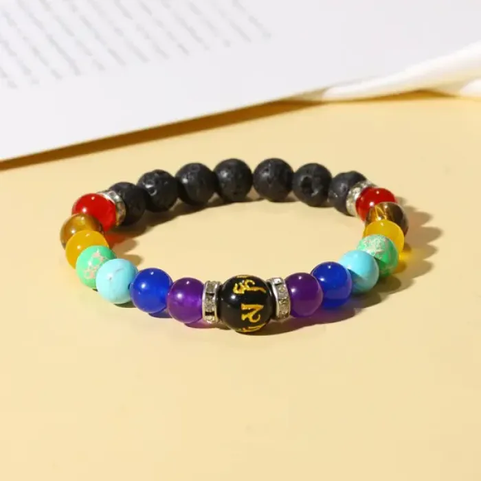 Стрейч-браслет из натуральных и синтетических камней с бусиной, на которую нанесена мантра.