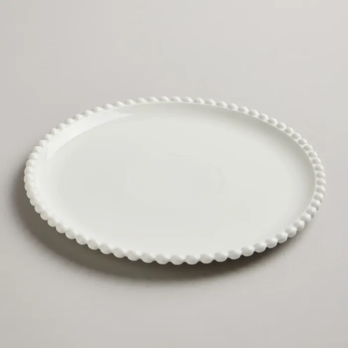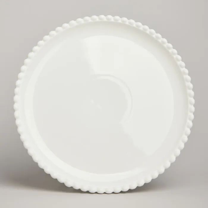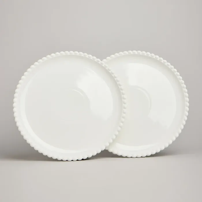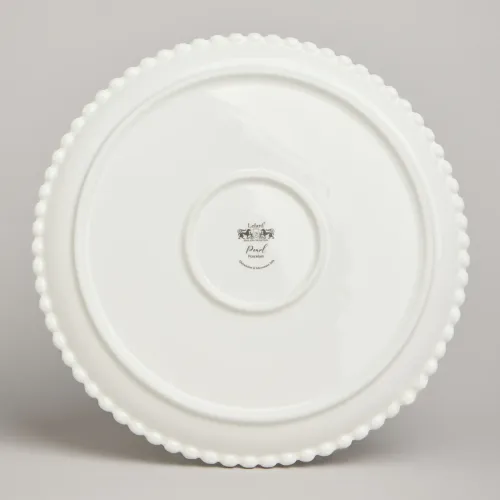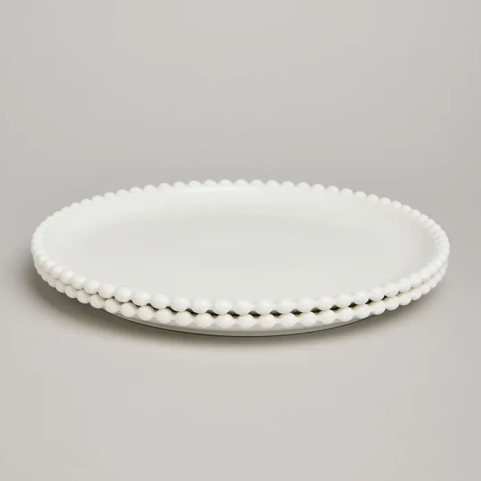 Тарелки выполнены из упрочнённого фарфора, который отличается повышенной стойкостью к механическим воздействиям. Край изделия оформлен рельефным декором в виде горошин. Данная конструкция является элементом дизайна коллекции.