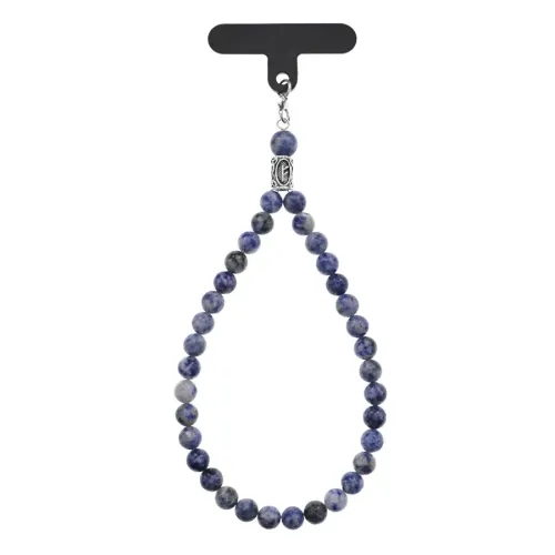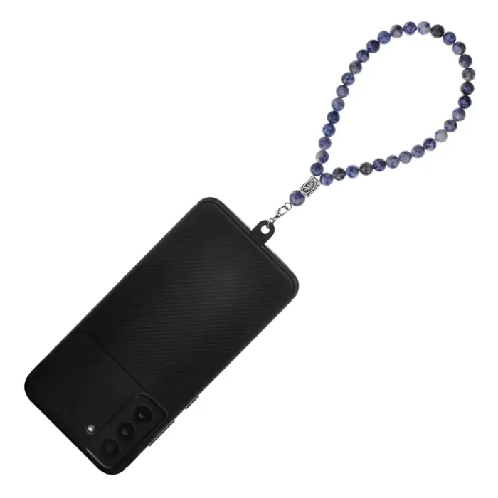 Петля для телефона, выполненная из бижутерного сплава, натурального содалита и пластика, с руническим дизайном.