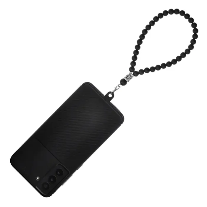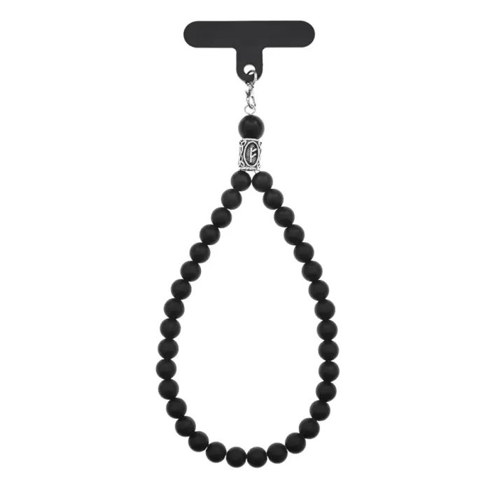 Петля для телефона, выполненная из бижутерного сплава, синтетического шунгита и пластика с руническим символом Феху.