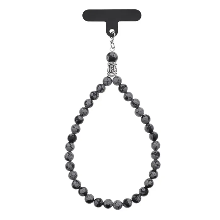 Петля для телефона ручной работы из бижутерного сплава, натурального снежного обсидиана и пластика с изображением руны Феху.