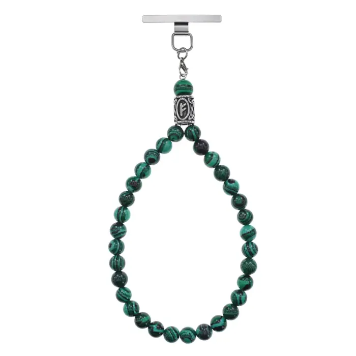 Петля для телефона ручной работы из нержавеющей стали с бусинами из синтетического малахита и рунической подвеской.
