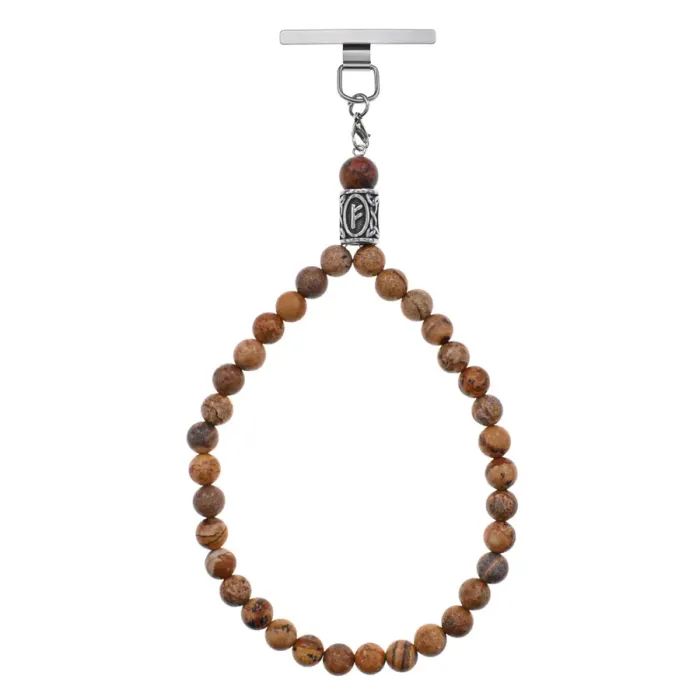 Петля для телефона ручной работы из нержавеющей стали с бусинами из натуральной песочной яшмы и рунической бусиной.