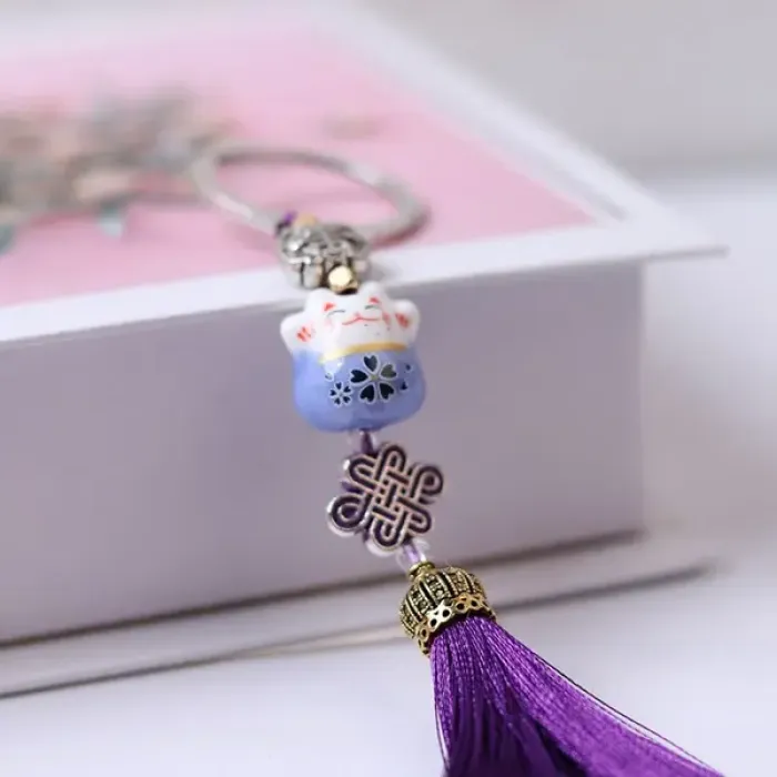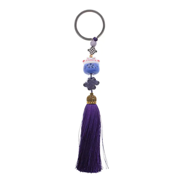 Брелок-сувенир, состоящий из фигурки Манеки-Неко и узла бесконечности. Материалы: керамика, акриловая нить, металл. Цвет фиолетовый.