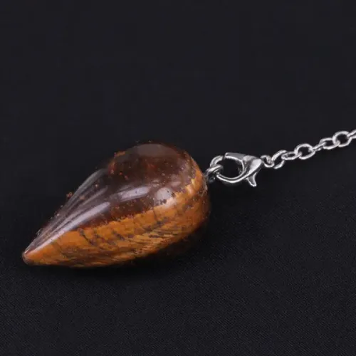 Маятник для биолокации из бижутерного сплава с покрытием под серебро и натурального камня тигровый глаз.