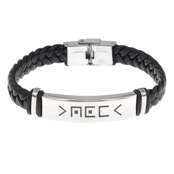 Кожаный браслет с гравировкой «Успех». Плетёный аксессуар из кожи и нержавеющей стали.
