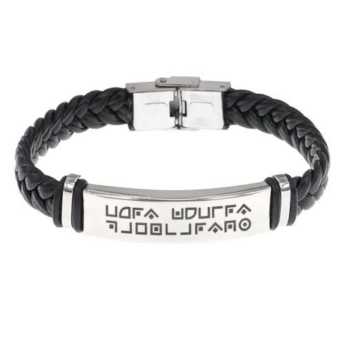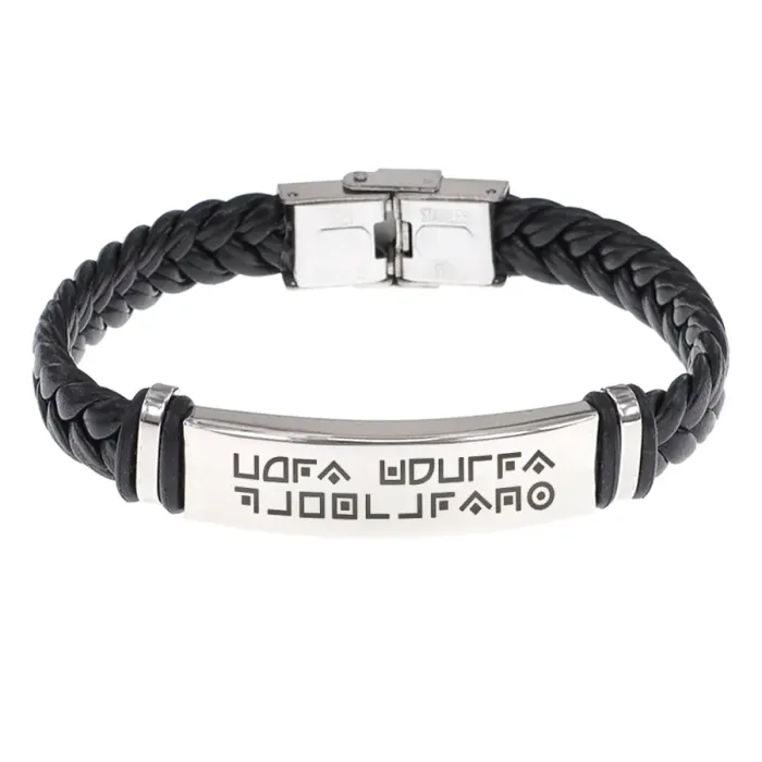 Кожаный браслет с гравировкой «Быть, любить, радоваться». Плетёный дизайн.