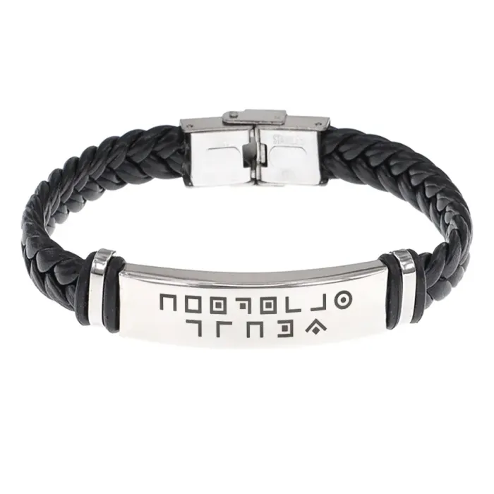 Кожаный браслет с гравировкой «Здоровая жизнь». Плетёный аксессуар из кожи и нержавеющей стали.