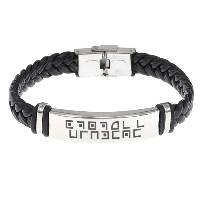 Кожаный браслет с гравировкой «Прорыв в бизнесе». Изготовлен из кожи и нержавеющей стали, имеет плетёную структуру.