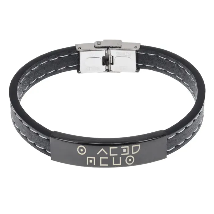 Кожаный браслет с гравировкой. Материал — экокожа и нержавеющая сталь.