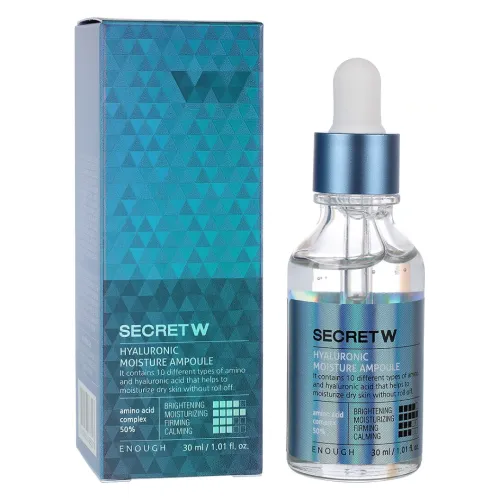 Ампульная сыворотка Secret With hyaluronic moisture ampoule от бренда Enough разработана для интенсивного увлажнения сухой кожи лица. Основу средства составляет аминокислотный комплекс и гиалуроновая кислота, которые способствуют поддержанию оптимального уровня влаги в коже. Продукт помогает улучшить текстуру кожи, делая её более гладкой и упругой.