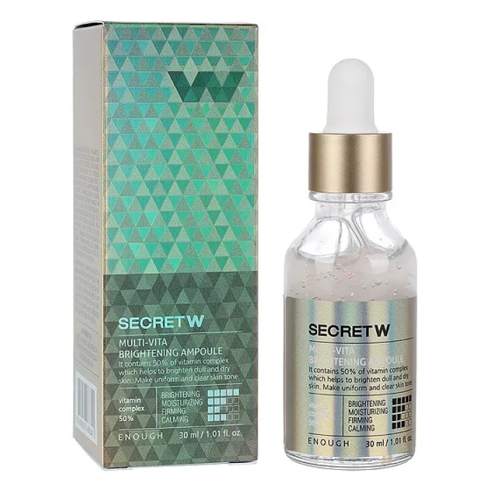 Эссенция для лица Secret With multi-vita brightening ampoule от бренда Enough — это ампульная сыворотка, разработанная для осветления пигментных пятен и веснушек. Средство придает сияние тусклой и сухой коже благодаря содержанию 50% мультивитаминного комплекса, который включает витамины A, B, C и E. В состав также входят экстракт розы и гиалуроновая кислота, которые способствуют увлажнению и питанию кожи.