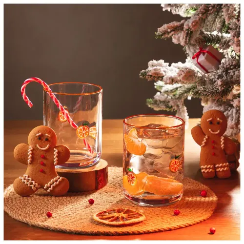 Стаканы выполнены вручную из стекла, что обеспечивает уникальность каждого предмета. Материал обладает гигиеничными свойствами и устойчив к воздействию напитков. Дизайн характеризуется гладкой поверхностью и оранжевым цветовым решением.
