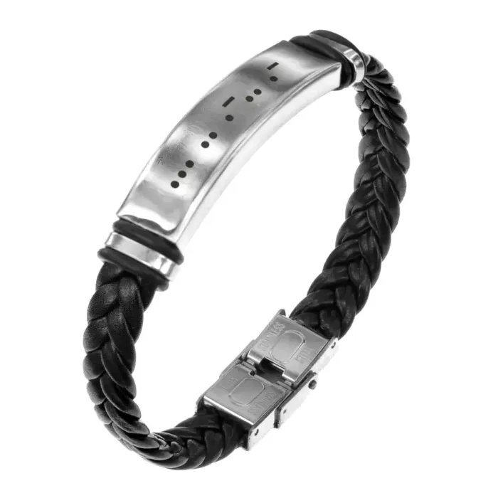 Кожаный браслет с гравировкой. Изготовлен из кожи и нержавеющей стали, имеет плетёную конструкцию.